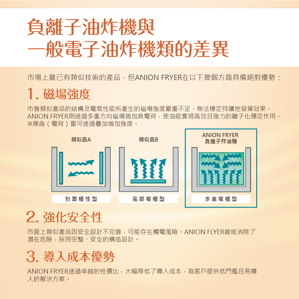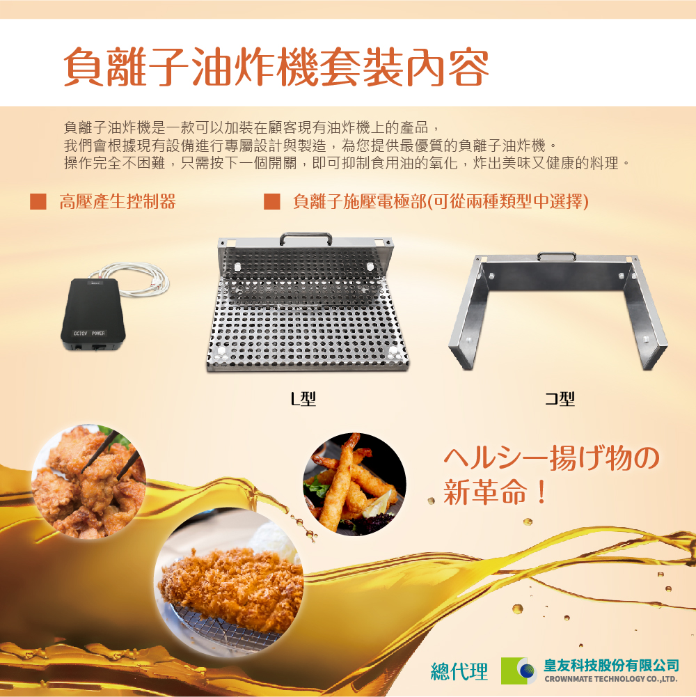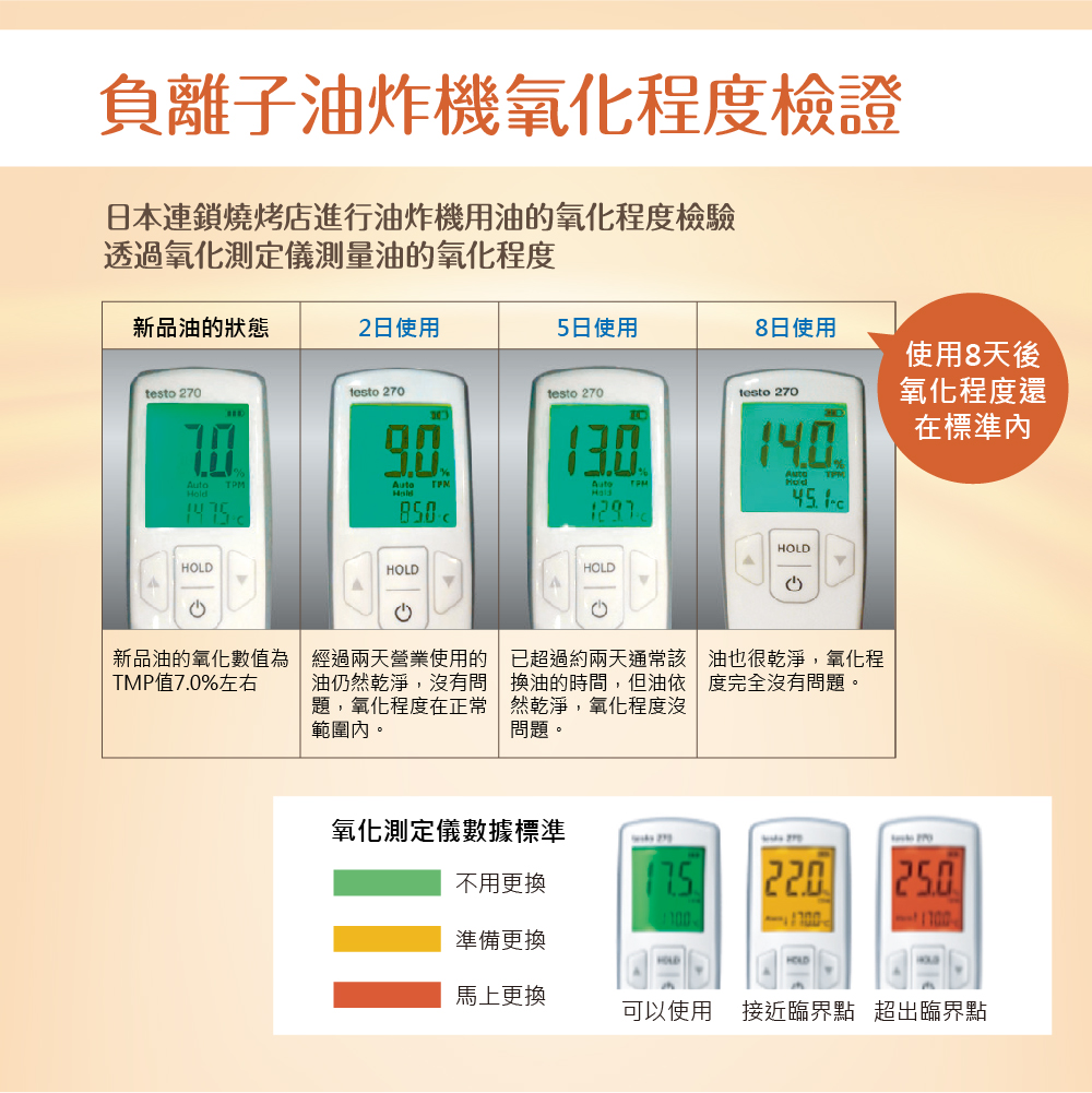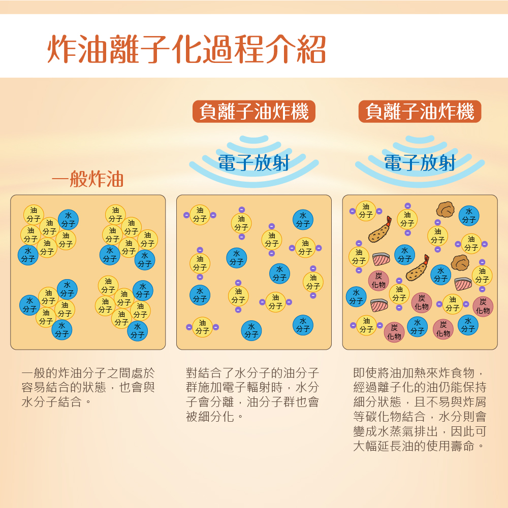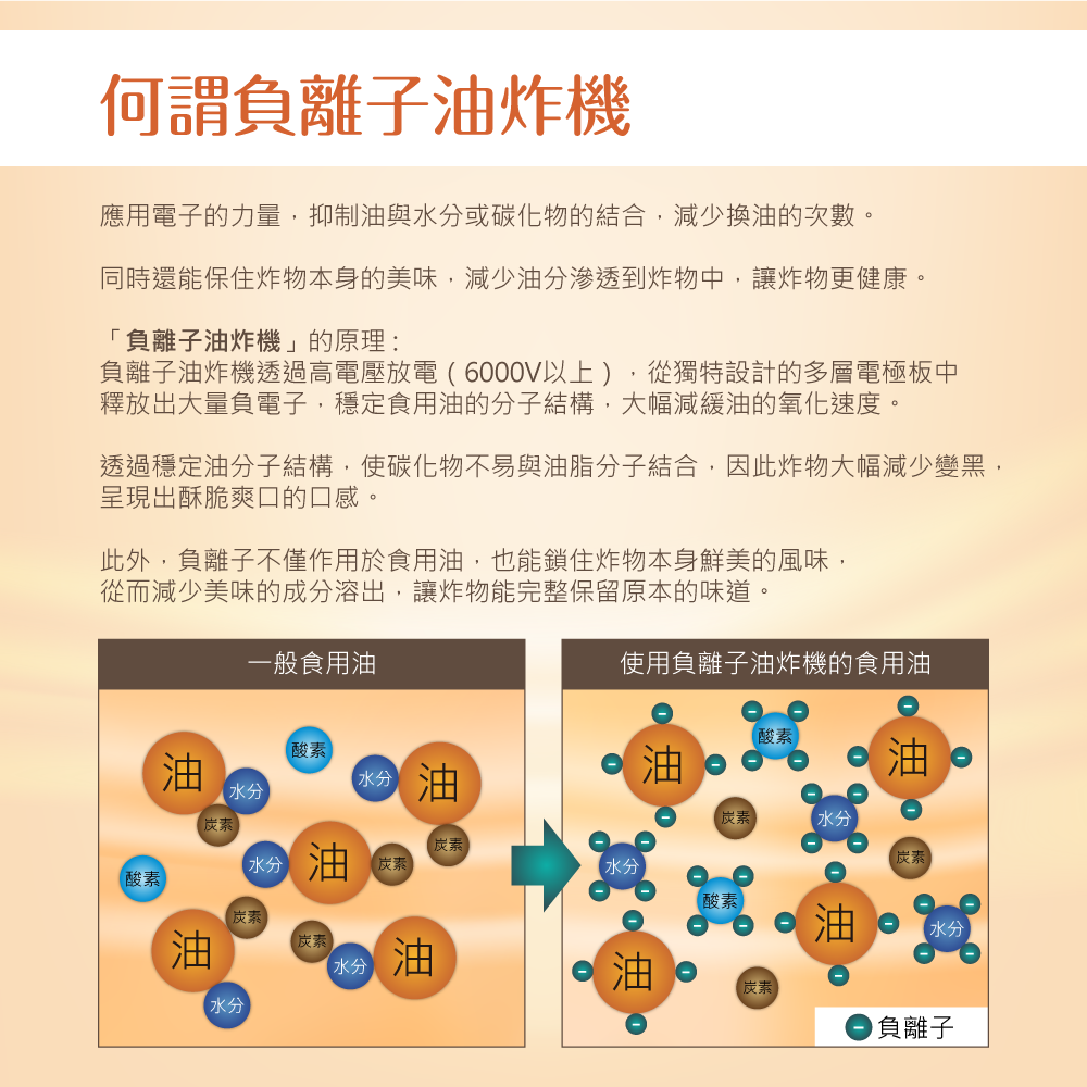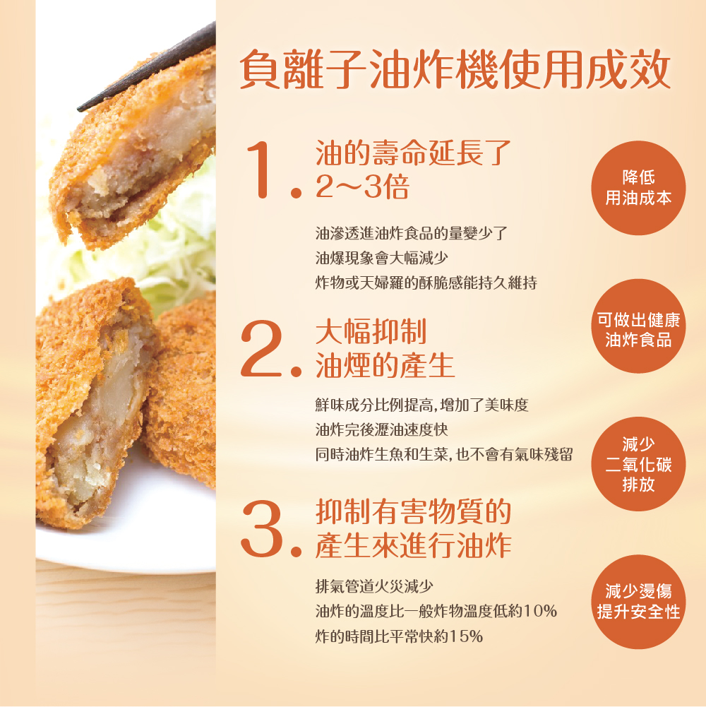 此外,負離子不僅作用於食用油,也能鎖住炸物本身鮮美的風味,從而減少美味的成分溶出,讓炸物能完整保留原本的味道。