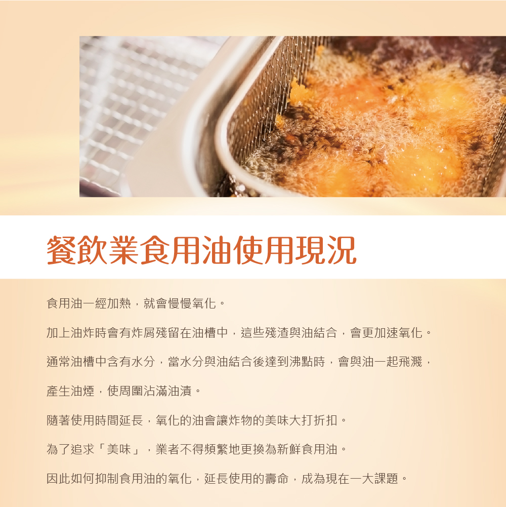 透過穩定油分子結構,使碳化物不易與油脂分子結合,因此炸物大幅減少變黑,呈現出酥脆爽口的口感。